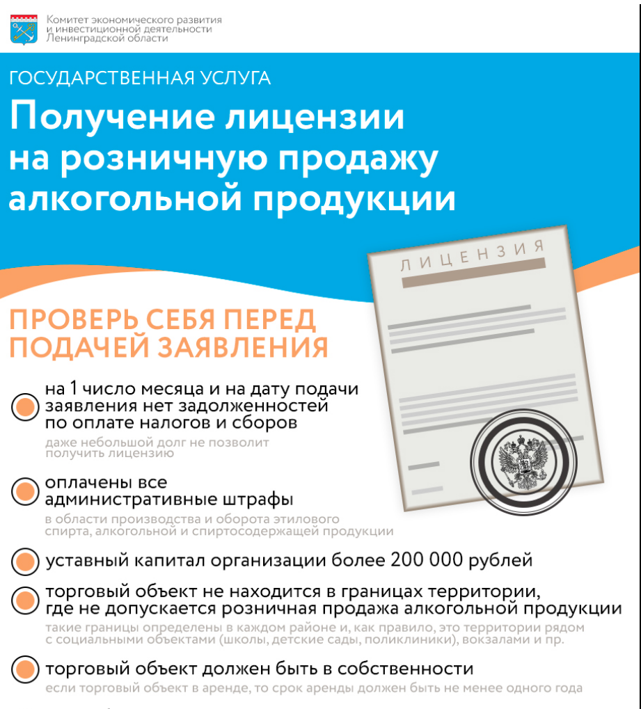 Государственную услугу «Лицензирование розничной продажи алкогольной продукции» предоставляет Комитет экономического развития и инвестиционной деятельности Ленинградской области. Структурным подразделением Комитета, ответственным за предоставление государственной услуги, является департамент государственного лицензирования.