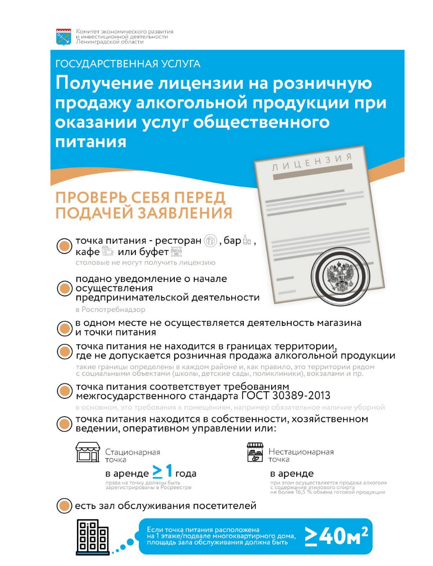 Государственную услугу «Лицензирование розничной продажи алкогольной продукции при оказании услуг общественного питания» предоставляет Комитет экономического развития и инвестиционной деятельности Ленинградской области. Структурным подразделением Комитета, ответственным за предоставление государственной услуги, является департамент государственного лицензирования.